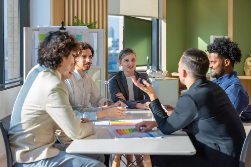 Equipo de marketing trabajando en cómo crear un buen storytelling durante una sesión estratégica en oficina creativa